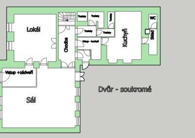 👉 jeden chlívek a část stodoly (ve dvoře) jako možné skladovací prostory,
